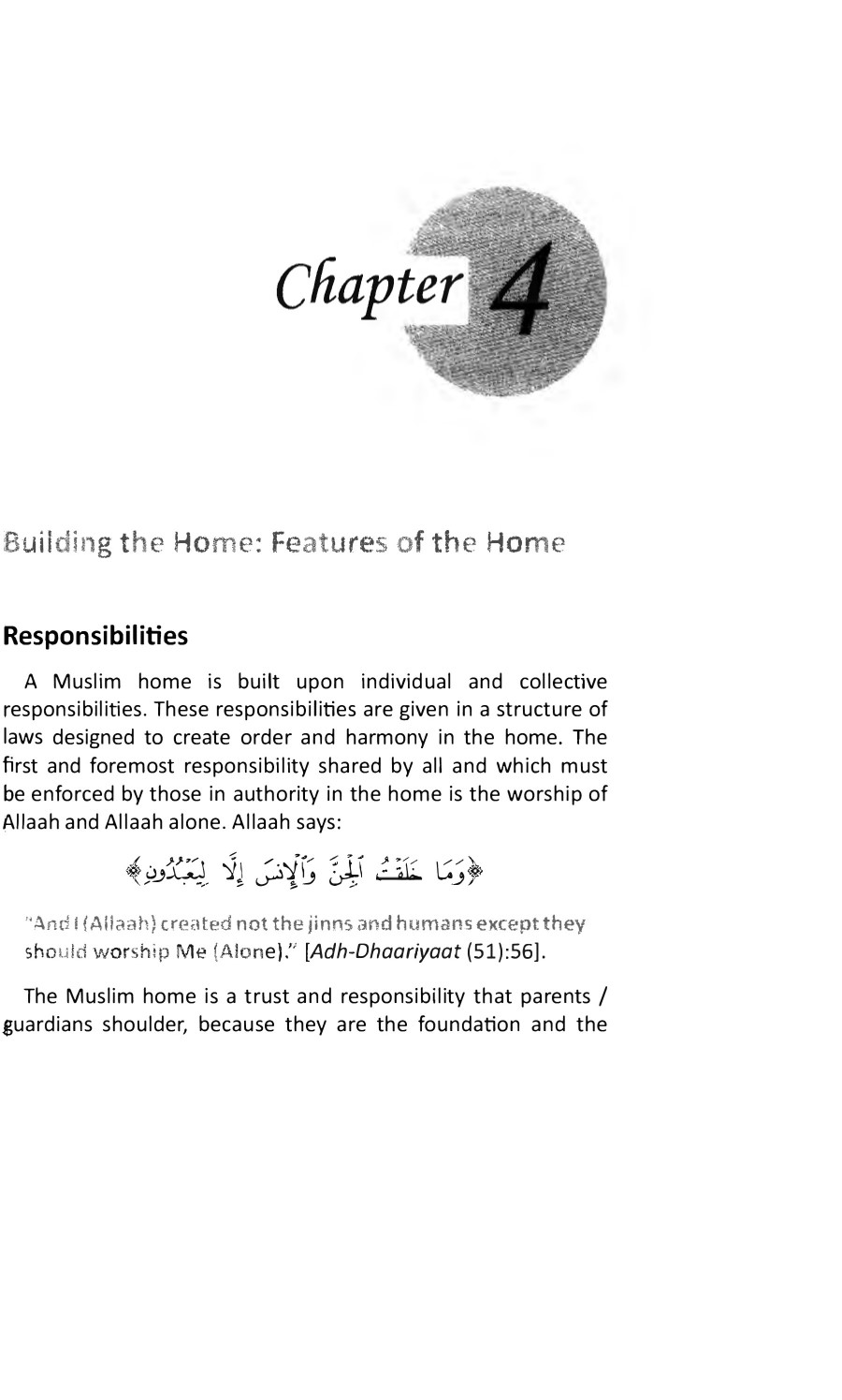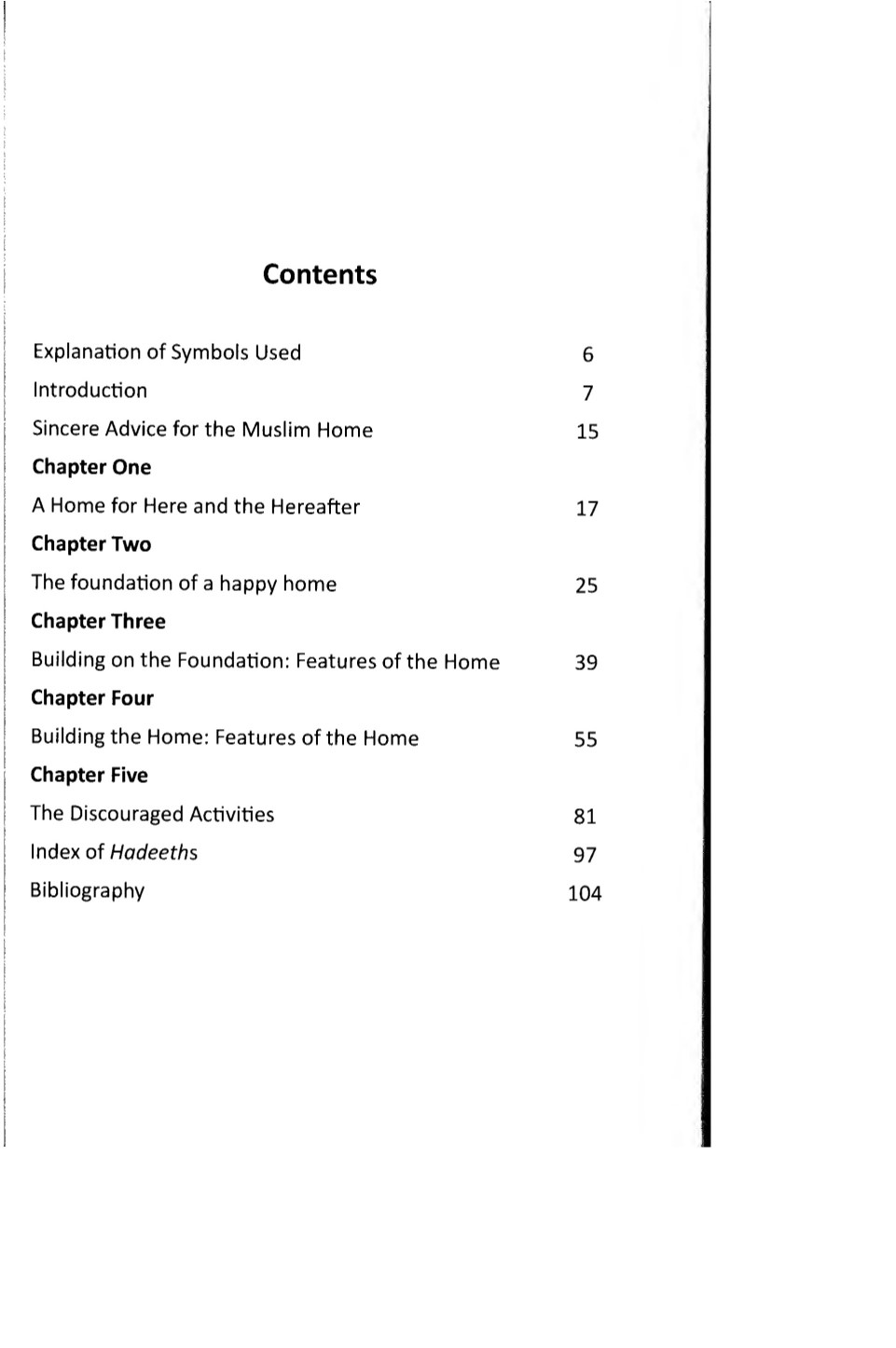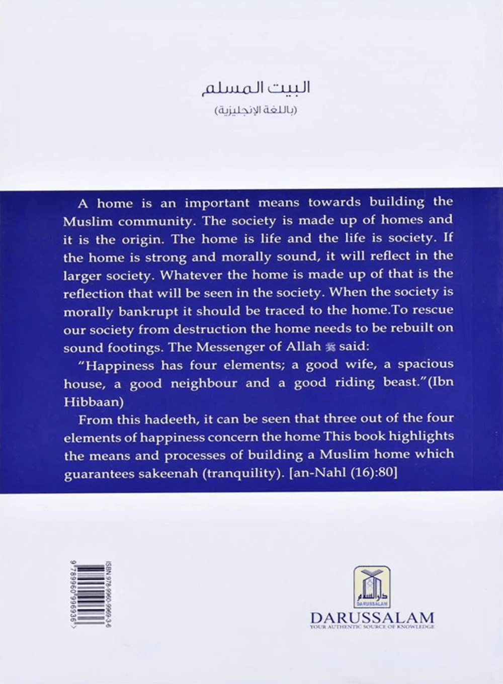 A home is an important means towards building the Muslimb community. The society is made up of homes and it is the origin. The home is life and the life is society. If the home is strong and morally sound, it will reflect in the larger society. Whatever the home is made up of that is the reflection that will be seen in the society. When the society is morally bankrupt it should be traced to the home. To rescue our society from destruction the home needs to be rebuilt on sound footings. The Messenger of Allah (peace be upon him) said: “Happiness has four elements; a good wife, a spacious house, a good neighbour and a good riding beast.” (Ibn Hibbaan) From this hadeeth, it can be seen that three out of the four elements of happiness concern the home This book highlights the means and processes of building a Muslim home which guarantees sakeenah (tranquility). [an-Nahl (16):80]
